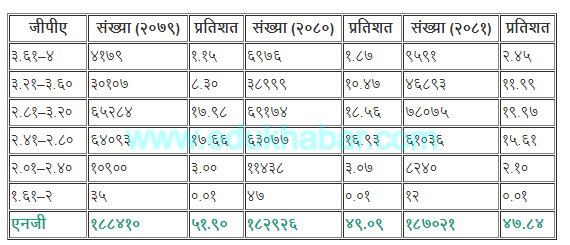 यस पालिको नतिजामा उच्च जीपीए ल्याउने विद्यार्थी विगतको भन्दा बढेकै छन् । तर यो नतिजालाई सरकारी अधिकारीहरुले पनि चित्त बुझाएमा छैनन् । ०७९ मा ३.६१ देखि ४ जीपीए ल्याउने प्रतिशत १.१५ थियो भने ०८० मा १.८७ पुगेको थियो । यसपाली यो समूहको जीपीए ल्याउने २.४५ प्रतिशत छ । त्यस्तै एनजी ल्याउने तीन वर्ष अघि ५१.९० प्रतिशत रहेकोमा गत वर्ष ४९.०९ प्रतिशतमा झरेको थियो । यसपाली गत वर्षको भन्दा १.२५ प्रतिशत नतिजा सुधार भएको देखिन्छ । यसपाली एनजी आउने विद्यार्थी ४७.८४ मात्रै छन् । परीक्षामा सहभागी तीन लाख ९० हजार आठ सय ६८ विद्यार्थीमा यसपाली एक लाख ८८ हजार चार सय १० विद्यार्थी अर्थात ४७.८४ प्रतिशतको नतिजा बिग्रिएको छ ।