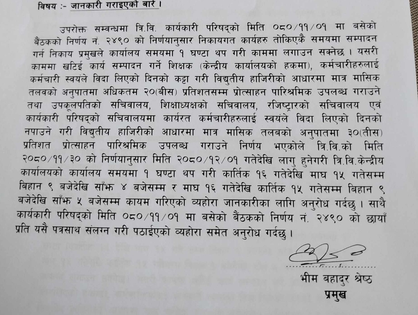 त्रिविमा एक घण्टा बढी काम गर्दा ३० प्रतिशत प्रोत्साहन भत्ता