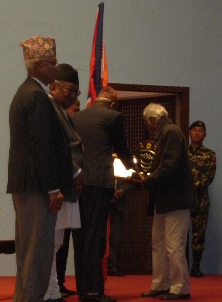 शिक्षा मन्त्री गोपालमान श्रेष्ठले दिएको पुरस्कार थाप्ने बेला उपाध्यायलाई निकै ठूलो हम्मे पर्यो ।