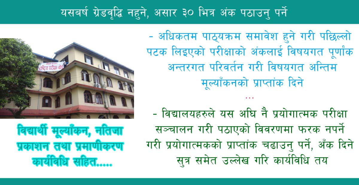 भक्तपुर - सम्बन्धित विद्यालयका प्रधानाध्यापकको अध्यक्षताको ३ सदस्यीय मूल्याँकन समितिले गर्ने आन्तरिक मूल्याँकनका आधारमा कक्षा १० का विद्यार्थीको नतिजा निकाल्ने गरी राष्ट्रिय परीक्षा बोर्डले मापदण्ड तय गरेको छ । विद्यालयका प्रधानाध्यापक सहित सम्बन्धित कक्षा शिक्षक र नियुक्तिका आधारमा जेष्ठ शिक्षक सहितको मूल्याँकन समिति गठन गर्ने गरी बोर्डले कार्यविधि निर्माण गरेको हो ।