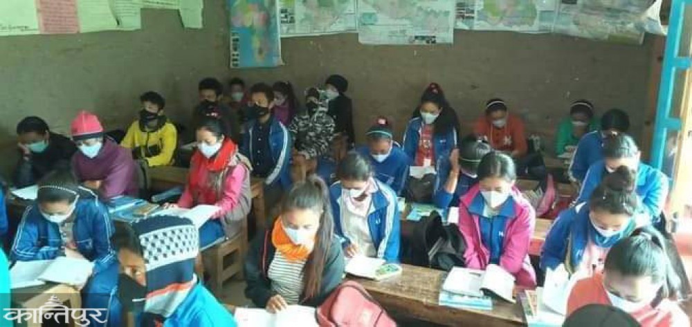 Figure: Picture of students wearing mask in the classroom of Mahabuddha Secondary School in Yalbang of Namkha Municipality before the closure, as 32 students were found COVID positive. (photo posted in 20 Nov 2020 on Kantipur Daily)