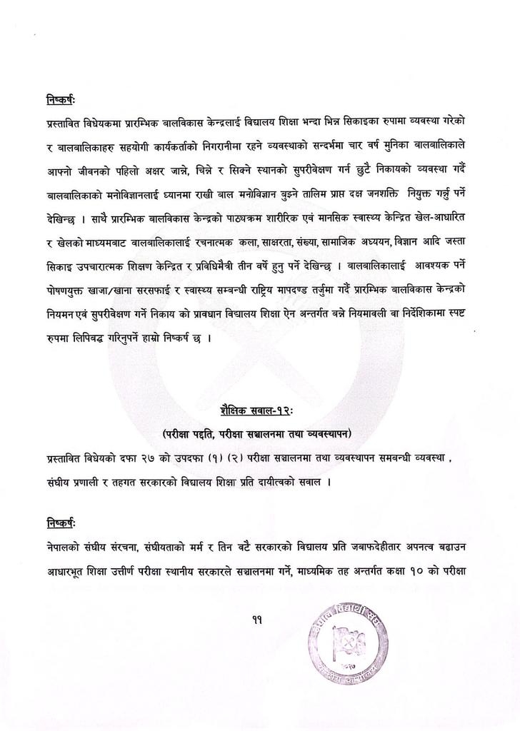 'सार्वजनिक शिक्षा मात्रै निशुल्क र निजी लगानीमा स्थापना भउका विद्यालयहरुले शुल्क लिन पाउने व्यवस्था नेपालको संविधान २०७२ को धारा ३१ संग बाझिएको देखिन्छ' संघको निष्कर्षमा भनिएको छ, 'हाल सञ्चालनमा रहेका विद्यालयहरु शैक्षिक गुठीमा रुपान्तरण हुनु पर्ने विषयलाई ऐच्छिक बनाईनुले प्रस्तावित विद्यालय शिक्षा विधेयक २०८० ऐनको रुपमा जारी भई लागु हुनु पुर्व निजी लगानीमा स्थापित विद्यालयहरुको एकाधिकार हुने र शैक्षिक गुठी अन्र्तगत निजी लगानीमा नयाँ विद्यालयहरु स्थापना गर्न चुनौतीपूर्ण हुने देखिन्छ ।'